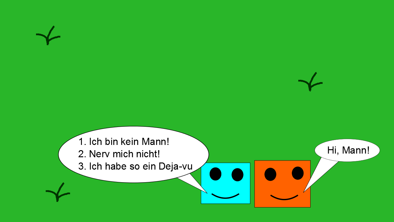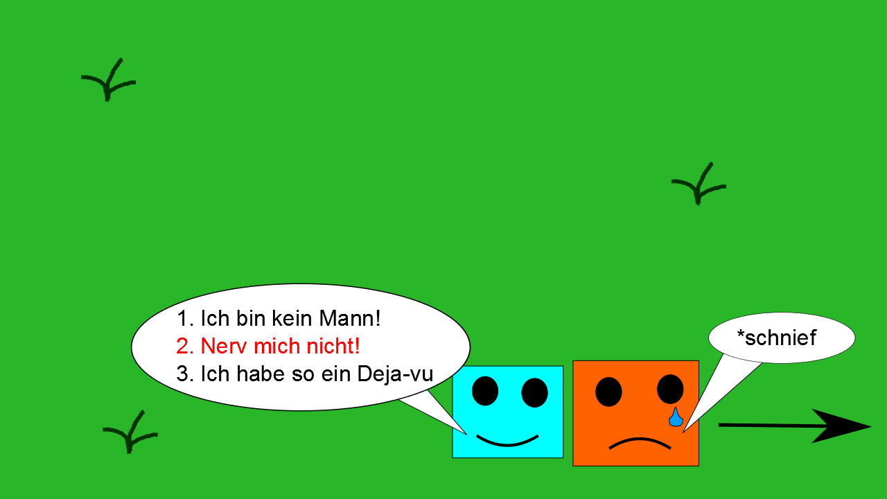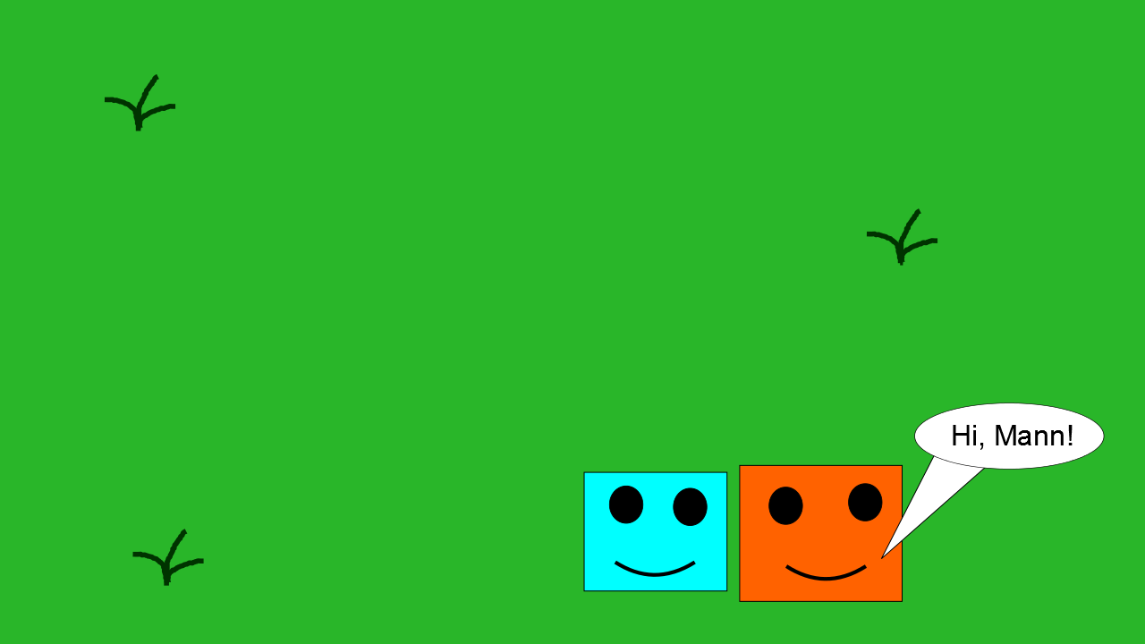 | Zwei Figuren stehen auf einer Wiese, ihr könnt das blaue Männchen steuern. |